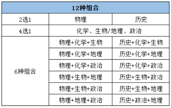 为增加考生和院校双向选择机会,考生志愿将采取“专业(类)+学校”的组合方式。选择考科目理论上有12种组合,具体组合如下: