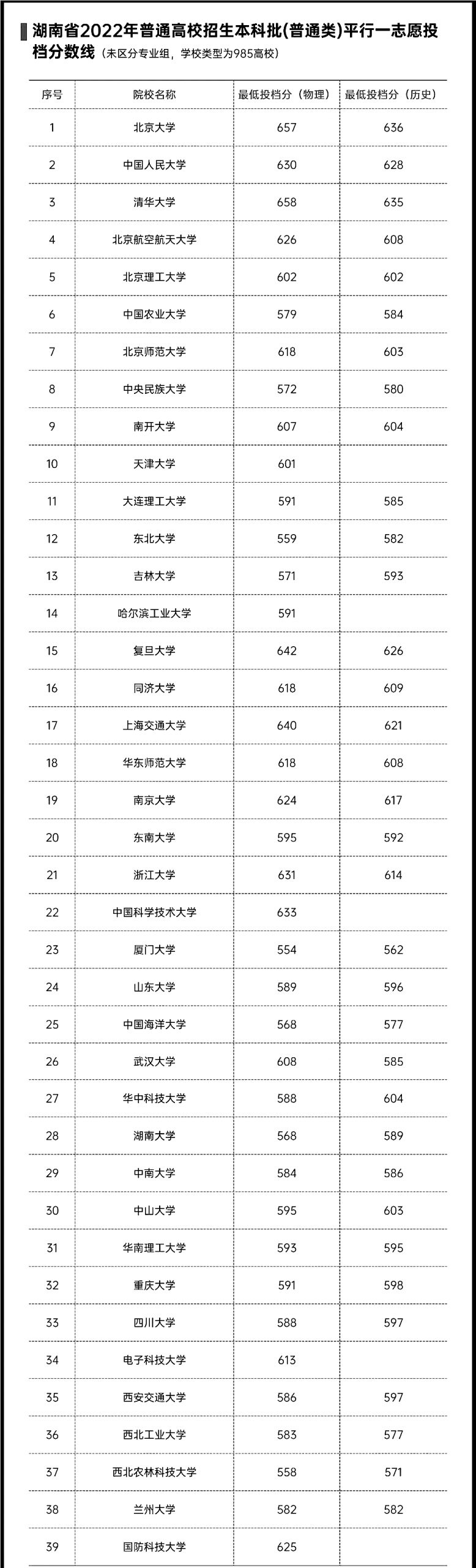 2022各大高校在京招生录取投档线已公布,为此,北京admw360教研组整理了湖南2022年985高校本科普通批录取投档线,分享给大家: