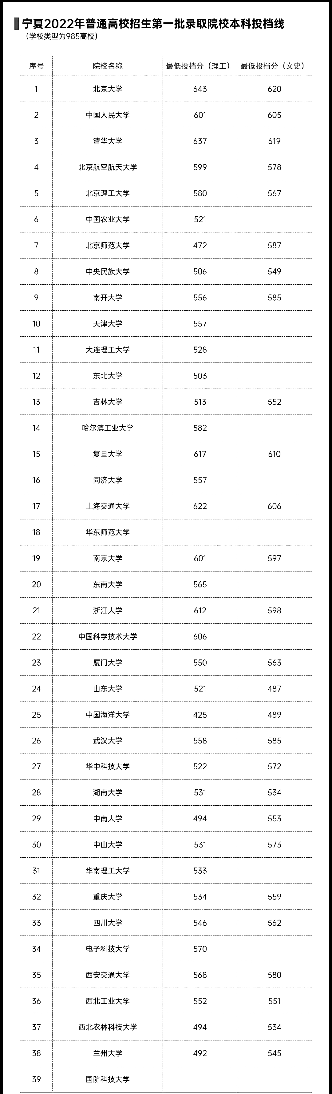 2022各大高校在京招生录取投档线已公布,为此,北京admw360教研组整理了985高校在宁夏本科普通批次录取最低投档线,分享给大家: