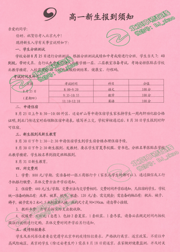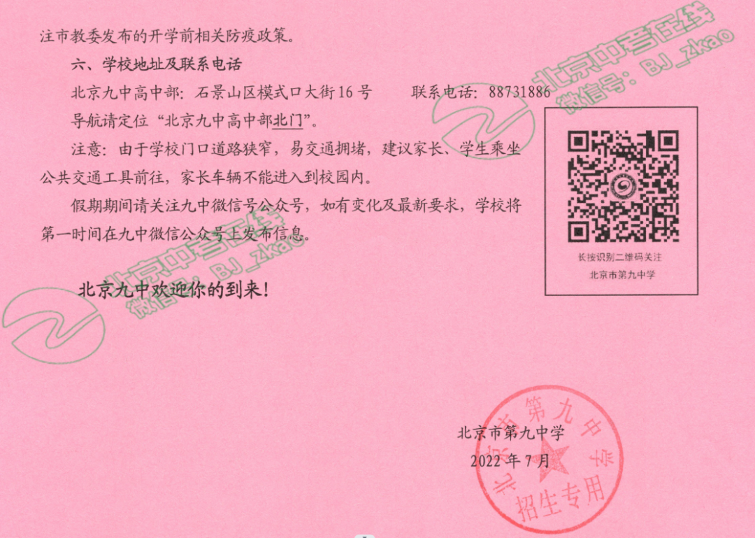 2022北京市第九中学新高一入学安排发布,为了方便各位同学做好开学准备,北京admw360教研组整理了北京五中新高一入学安排,一起看下。