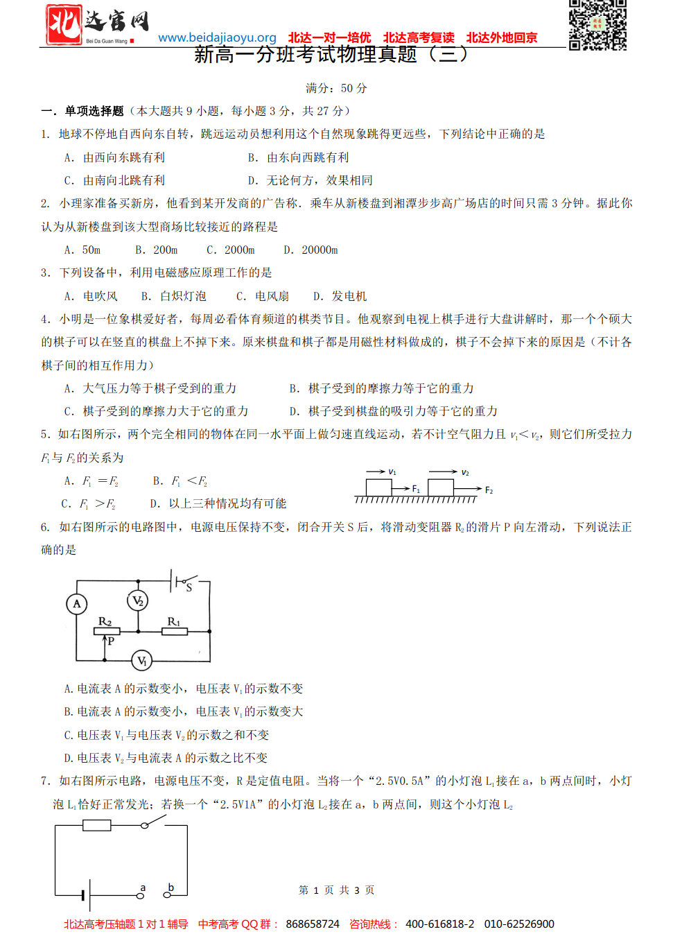 北京清华附中2019-2020学年新高一物理分班考试试题(带解析)