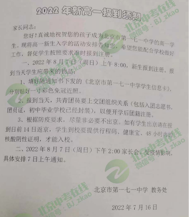 2022年北京一七一中学新高一入学安排发布,为了方便各位同学做好开学准备,北京admw360教研组整理了内容详情,一起看下。