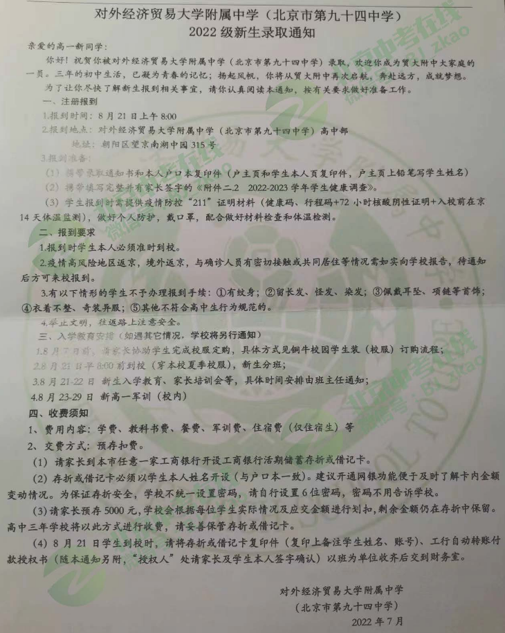 北京贸大附中2022年新高一入学安排