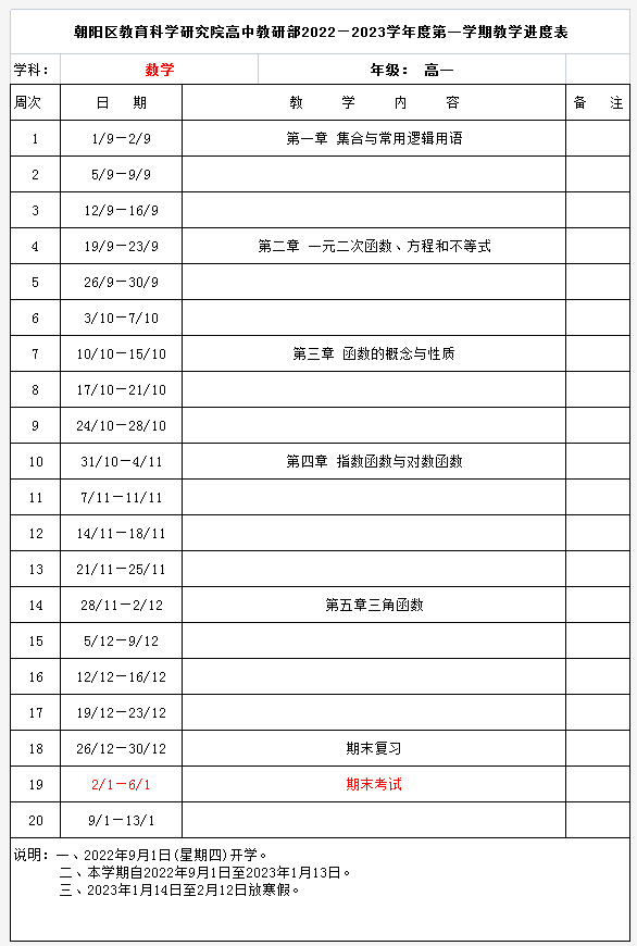 日前,朝阳区教育研究中心公布了《高中2022-2023学年度第一学期进度表》,详细介绍了第一学期每门科目每月的教学进度,北京admw360教研组为大家整理的是2022年北京朝阳区高一第一学期数学教学进度表,一起来看。