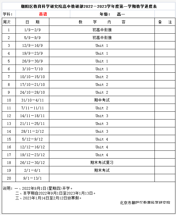 日前,朝阳区教育研究中心公布了《高中2022-2023学年度第一学期进度表》,详细介绍了第一学期每门科目每月的教学进度,北京admw360教研组为大家整理的是 2022北京朝阳高一第一学期(英语)教学进度表,一起来看。