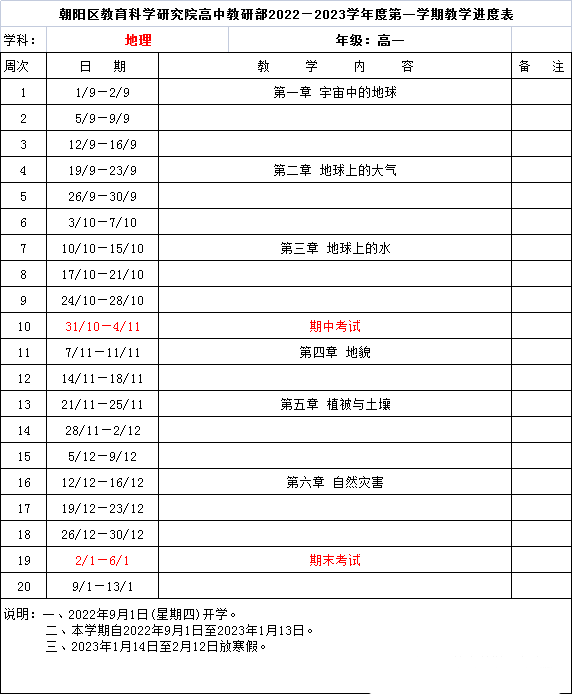日前,朝阳区教育研究中心公布了《高中2022-2023学年度第一学期进度表》,详细介绍了第一学期每门科目每月的教学进度,北京admw360教研组为大家整理的是2022北京朝阳高一第一学期地理教学进度表,一起来看。