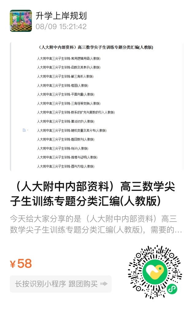 今天为大家整理了(人大附中内部资料)高三数学尖子生训练专题分类汇编(人教版),分享给大家,需要的同学可扫描下方二维码进入快团团自行购买。