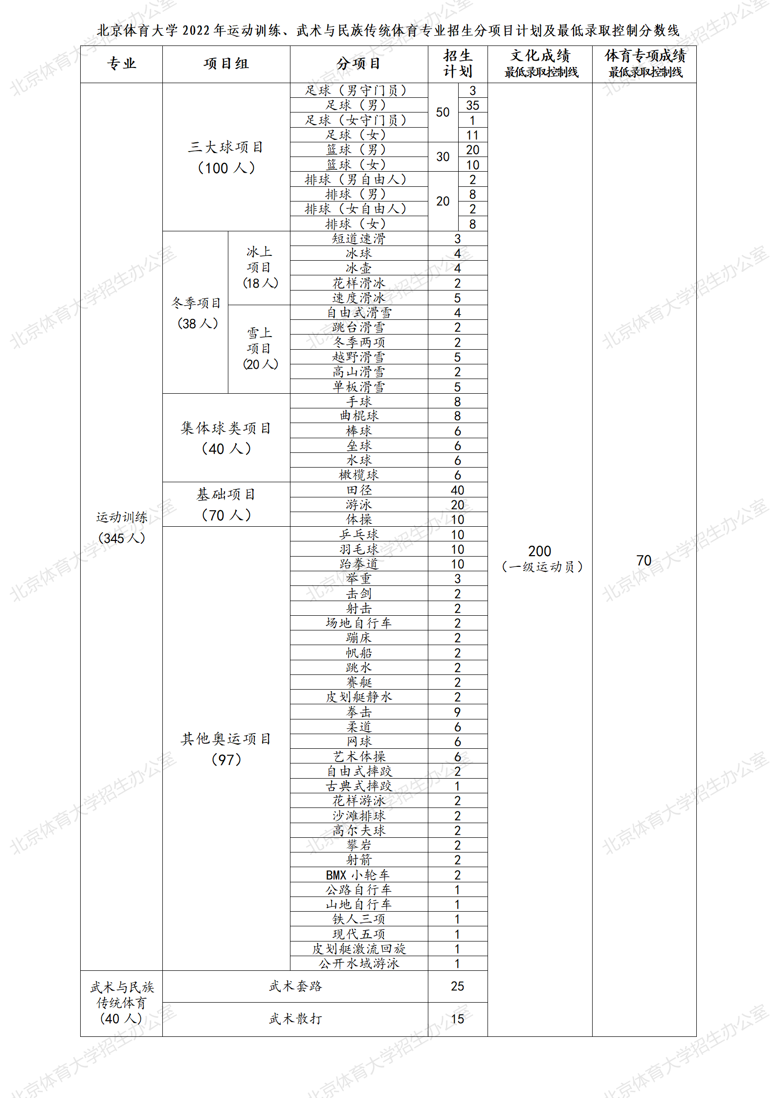 遵循“公平、公正、公开”原则,结合国家体育事业发展战略需求、学校改革发展、教学条件、师资力量等情况,根据已向社会公布的“北京体育大学2022年运动训练、武术与民族传统体育专业招生分项目计划及最低录取控制分数线”(附件1)相关要求,确定2022年运动训练、武术与民族传统体育专业拟录取名单(不含上海生源)。