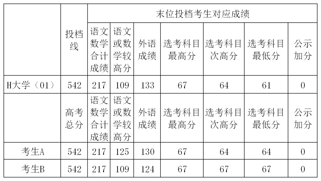 先看考生A,按照同分排序原则,先比较语文和数学合计成绩,均为217分;则再比较语文、数学中的单科较高成绩,考生A的语数单科较高成绩125分高于H大学(01)末位投档考生的语数单科成绩109分,故考生A被成功投档至H大学(01),不再看后面的数据。