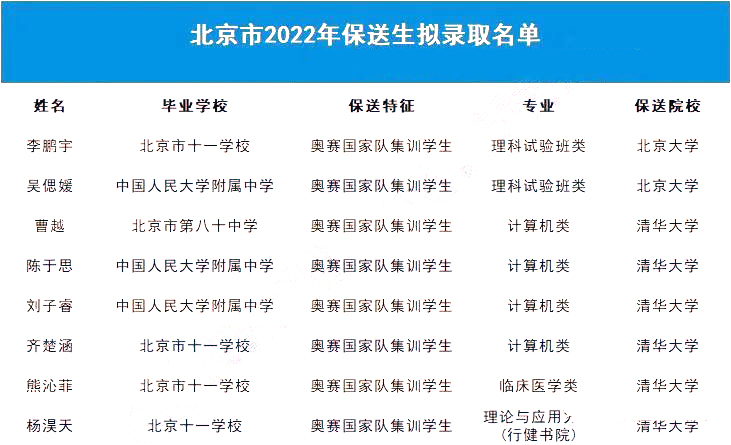 2022年北京8人被清北录取,全部为奥赛国家队集训学生。因此对于23届及低年级的同学来说,想走保送这条路,五大学科竞赛一定要重点关注。并且在五大学科竞赛中获得金牌、银牌的考生具有强基计划破格入围资格,可以直接进入校测环节。省一省二省三的选手也可以尝试报考清华数学领军计划,以及中科大、西交、东南大学的少年班。