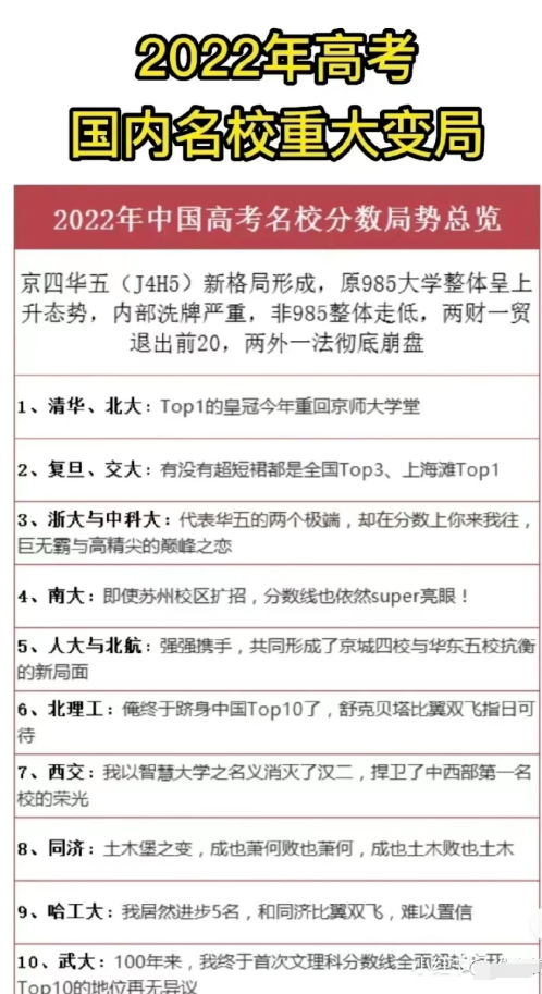 2022年的高考,随着各省市录取分数线的公布也基本上尘埃落定了。部分开学早的高校,甚至已经在准备迎接新的一批大一新生的入校了。那么回顾今年的高考,这不长不短,前前后后历时一个多月,但是给我们带来的变化是让我们意想不到的。那么今年高考各大高校的竞争格局又是怎样的呢?