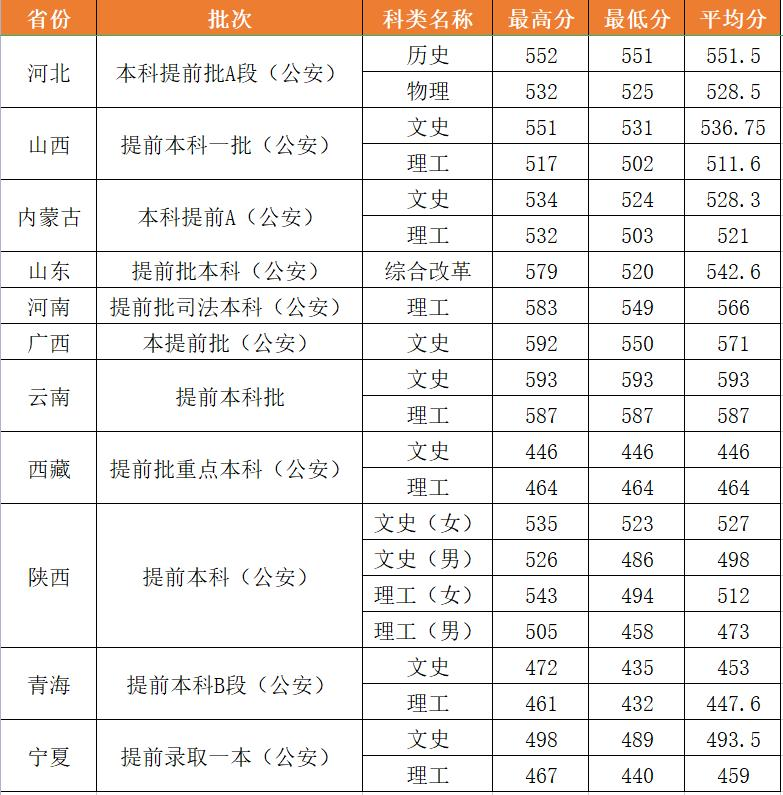 截止7月11日,我校在河北、山西、内蒙古、山东、河南、广西、云南、西藏、陕西、青海、宁夏的提前批次公安类录取结束,具体如下: