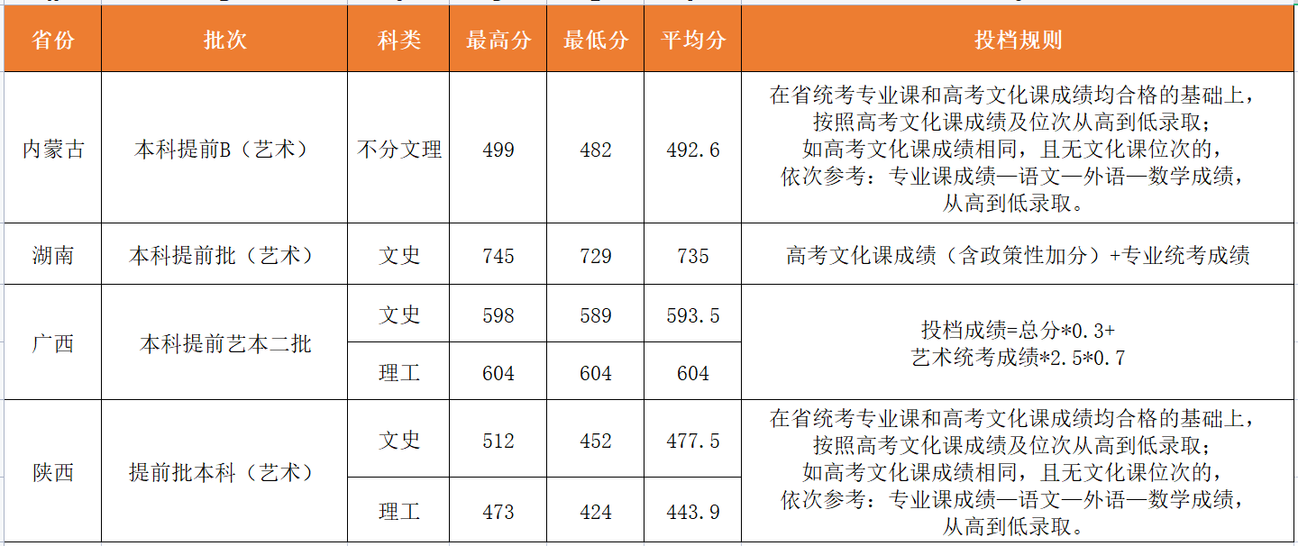 截止7月15日,我校在内蒙古、湖南、广西、陕西的提前批次艺术类录取结束,具体如下: