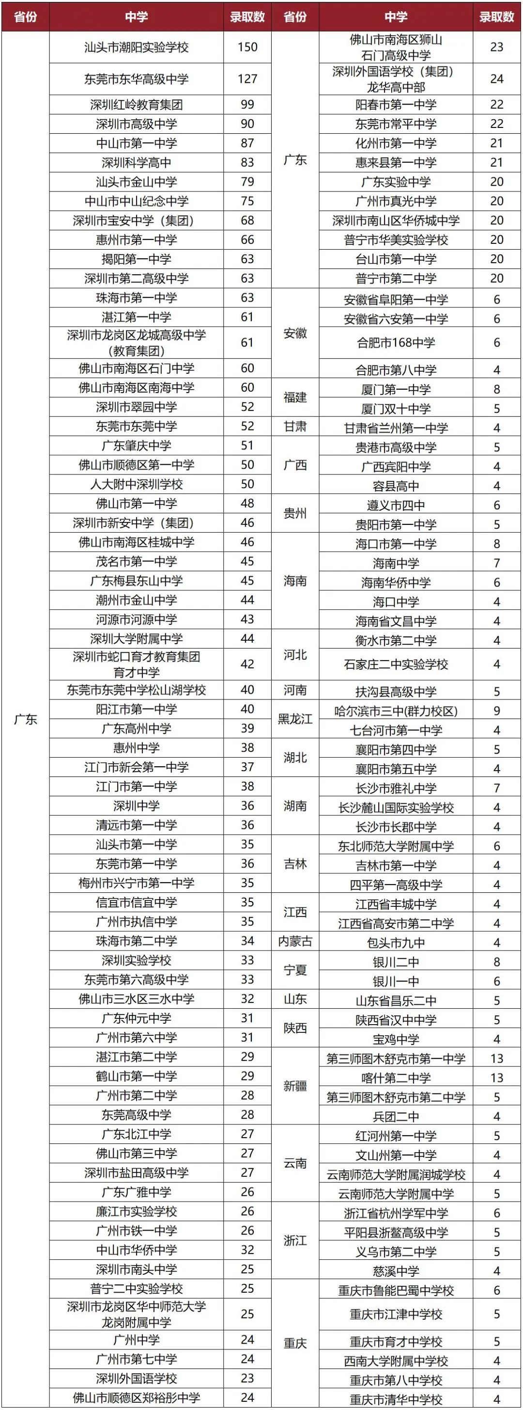 绝大部分考生来自全国知名重点中学,其中,广东省和外省录取人数较多的中学如下: