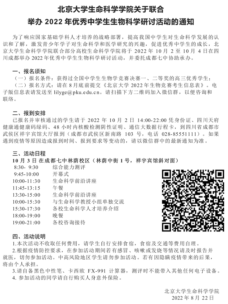 近日,北京大学生命科学学院发布2022年优秀中学生生物科学研讨活动的通知,北京admw360教研组第一时间为大家整理了内容详情,获得全国中学生生物学竞赛决赛一、二等奖的高三优秀学生可在8月底之前进行报名,活动时间为2022年10月2日-4日。具体通知如下: