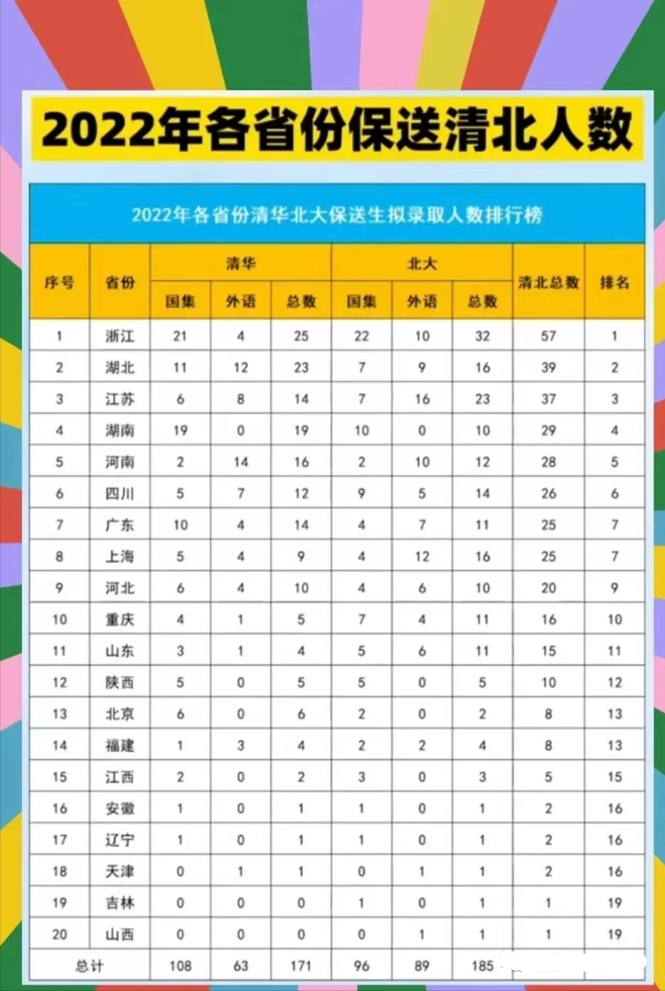在解释完这个概念之后,我们再来看看今年各省市保送清北的情况。浙江,作为素质教育的大省,全国今年为止,除了三大直辖市之外,唯一选择高考自主命题的省份,其总共有57名学生保送清北,其中国家集训队的同学占到了43人,这个数据是冠绝全国,且绝无仅有只此一家的水平。排名二三位的,也是以素质教育闻名的湖北省和江苏省。两家分别有39名和37名保送清北的学生,但是和浙江的体量相比还是略逊一筹。