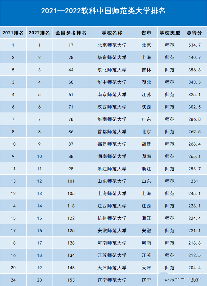 2022软科中国师范类大学排名的上榜高校有100+所,其中有2所北京高校上榜,分别是蝉联榜首的北京师范大学和位于第八名的首都师范大学。