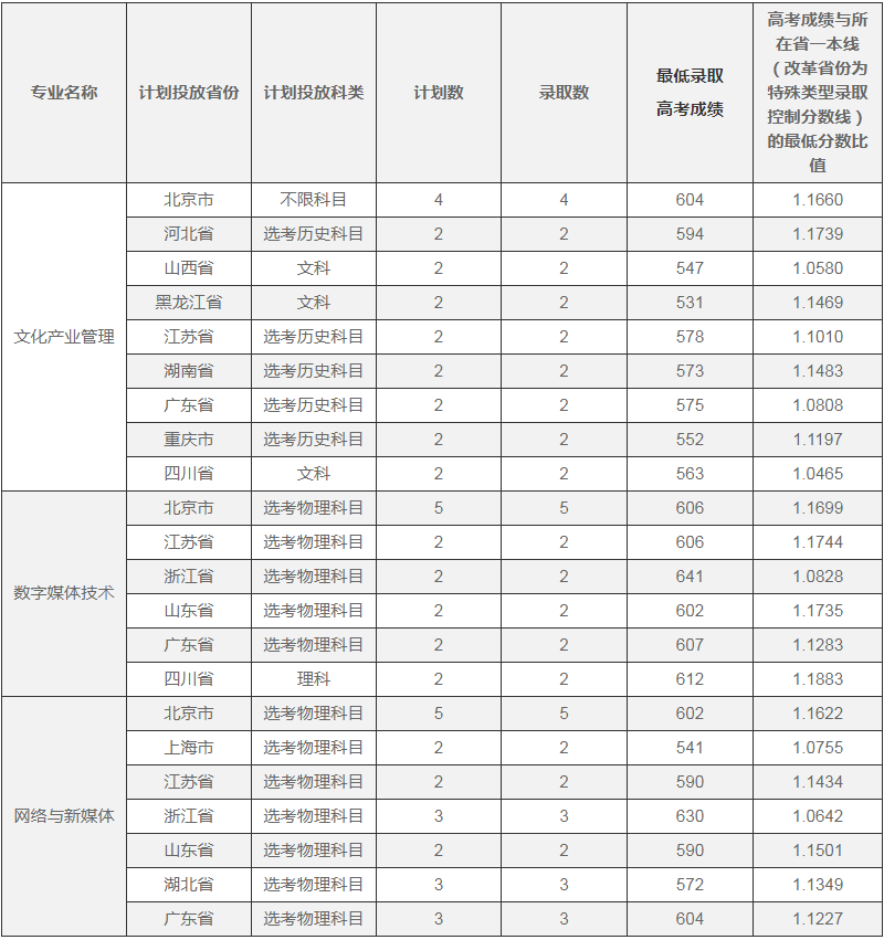注2:表格中的最后一列,戏剧影视表演专业、表演艺术专业为该专业的最低录取省内专业排名;人物形象设计专业、影视动画专业为该专业的最低录取省内排序综合成绩。