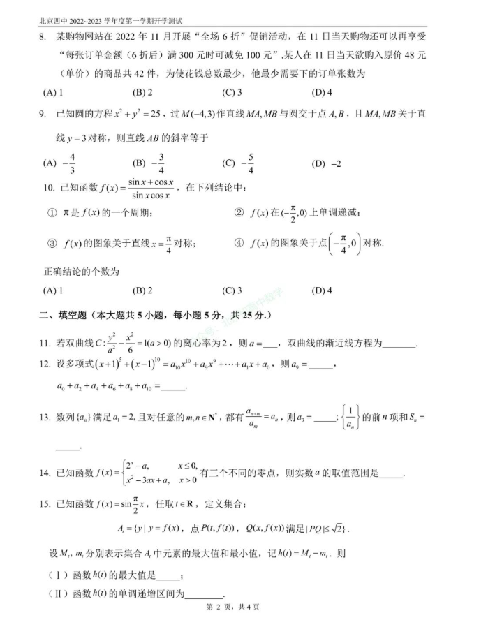 相关阅读:2022.8北京实验、五中高三开学测数学试题及答案