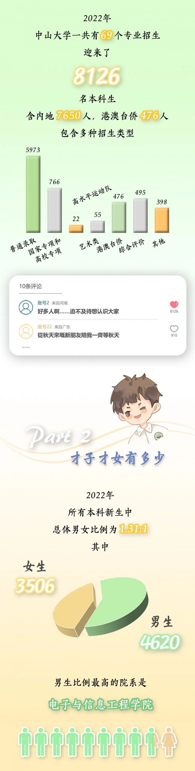 2022年中山大学一共有69个专业招生,迎来了8126名本科生,含内地7650人,港澳台侨476人。