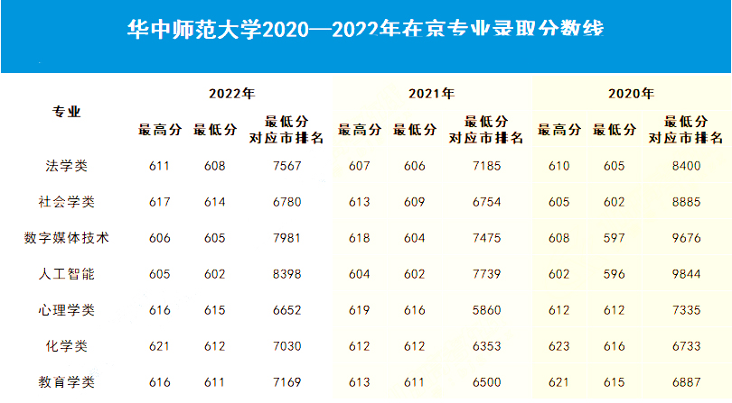 北京admw360教研组为大家整理了2020-2022年华中师范大学在京专业录取分数线,一起来看: