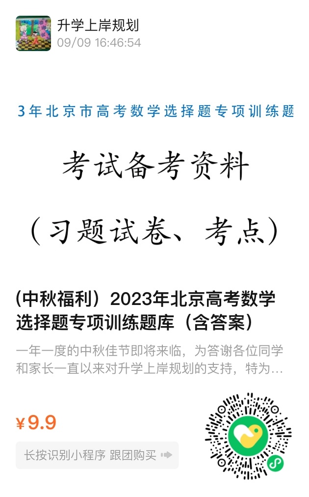 一年一度的中秋佳节即将来临,为答谢各位同学和家长一直以来对升学上岸规划的支持,特为大家做一期特价福利,9.9元秒2023年北京市高考数学选择题专项训练题库(含答案)。识别下方小程序二维码可直接秒杀: