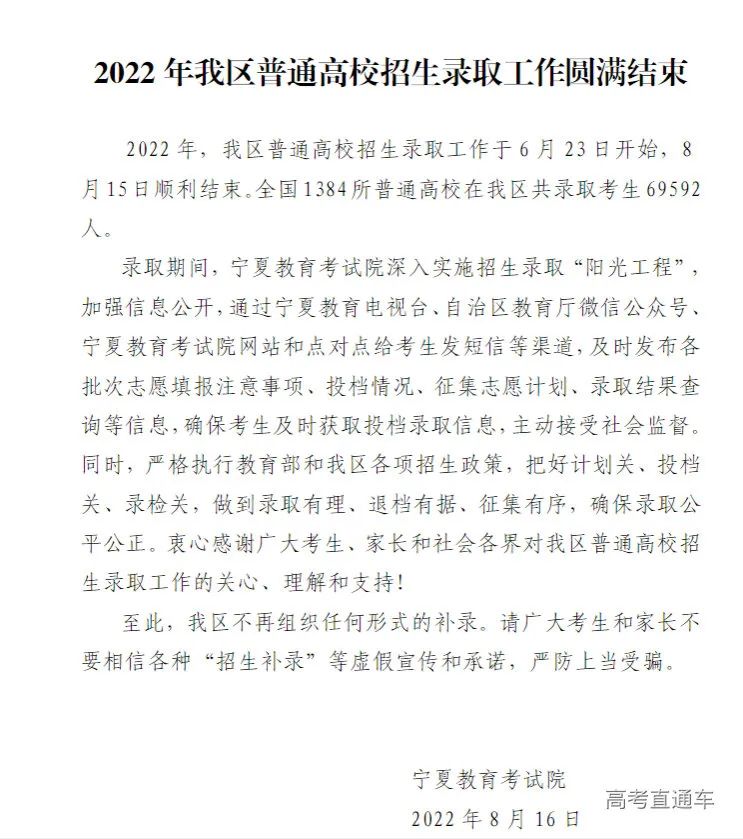 录取结束后,我省不再组织任何形式的高考补录。对于社会上可能出现的各种 “补录”“扩招”相关虚假宣传及承诺,请广大考生和家长提高警惕,谨防上当受骗。