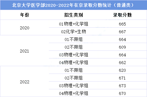 2020年-2021年,北京大学医学部相同专业组录取分数基本一样,而2021-2022年,录取分数整体来说有所增加:2个不限组分别增加了2分、11分(这里要说明一点:2022年2个不限招生专业组序号与2021年做了调换,也就是2022年的01不限组对应的是2021年的02不限组,2022年的02不限组对应的是2021年的01不限组),03物理+化学组、04物理+化学组分别增加了9分、8分。