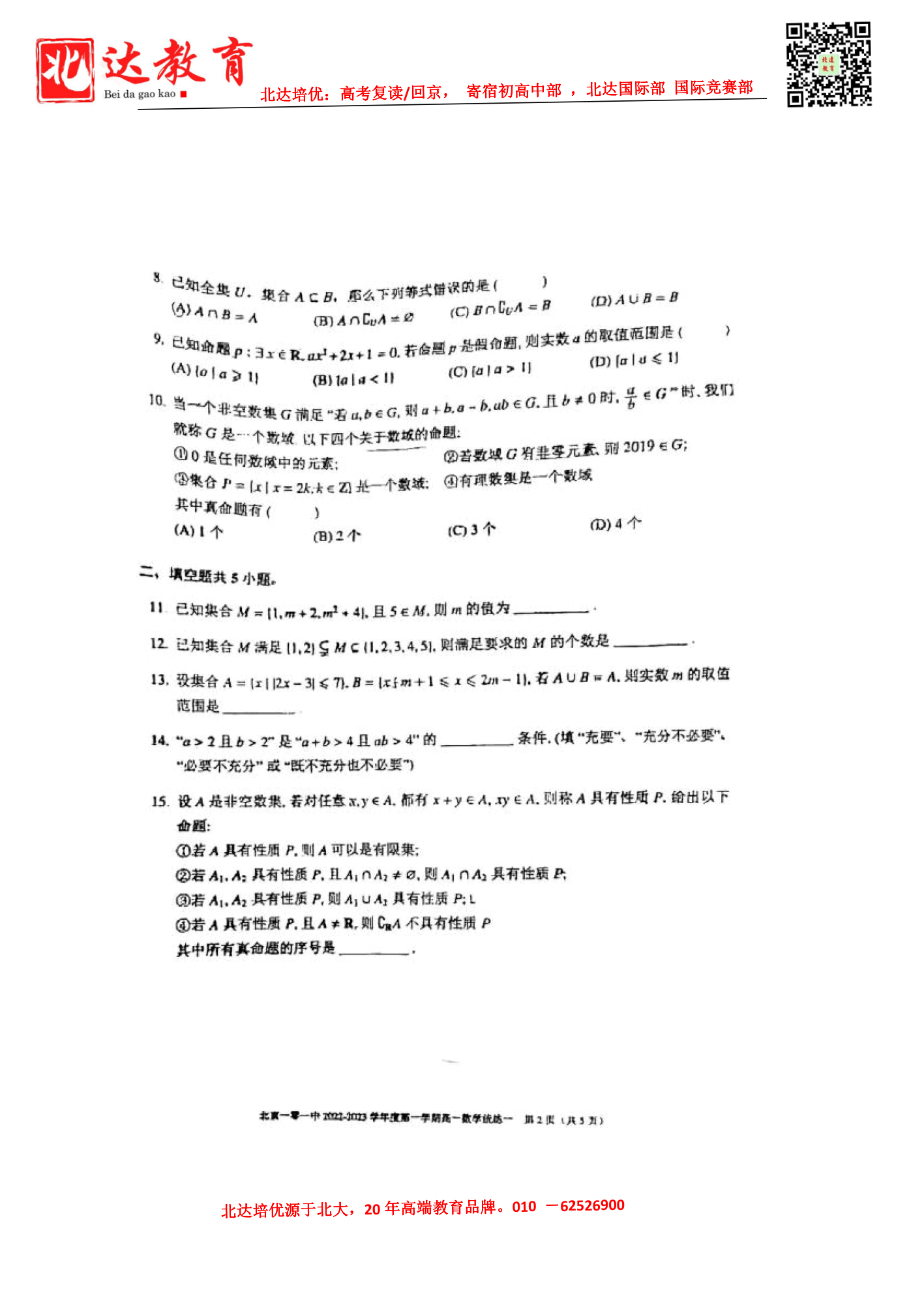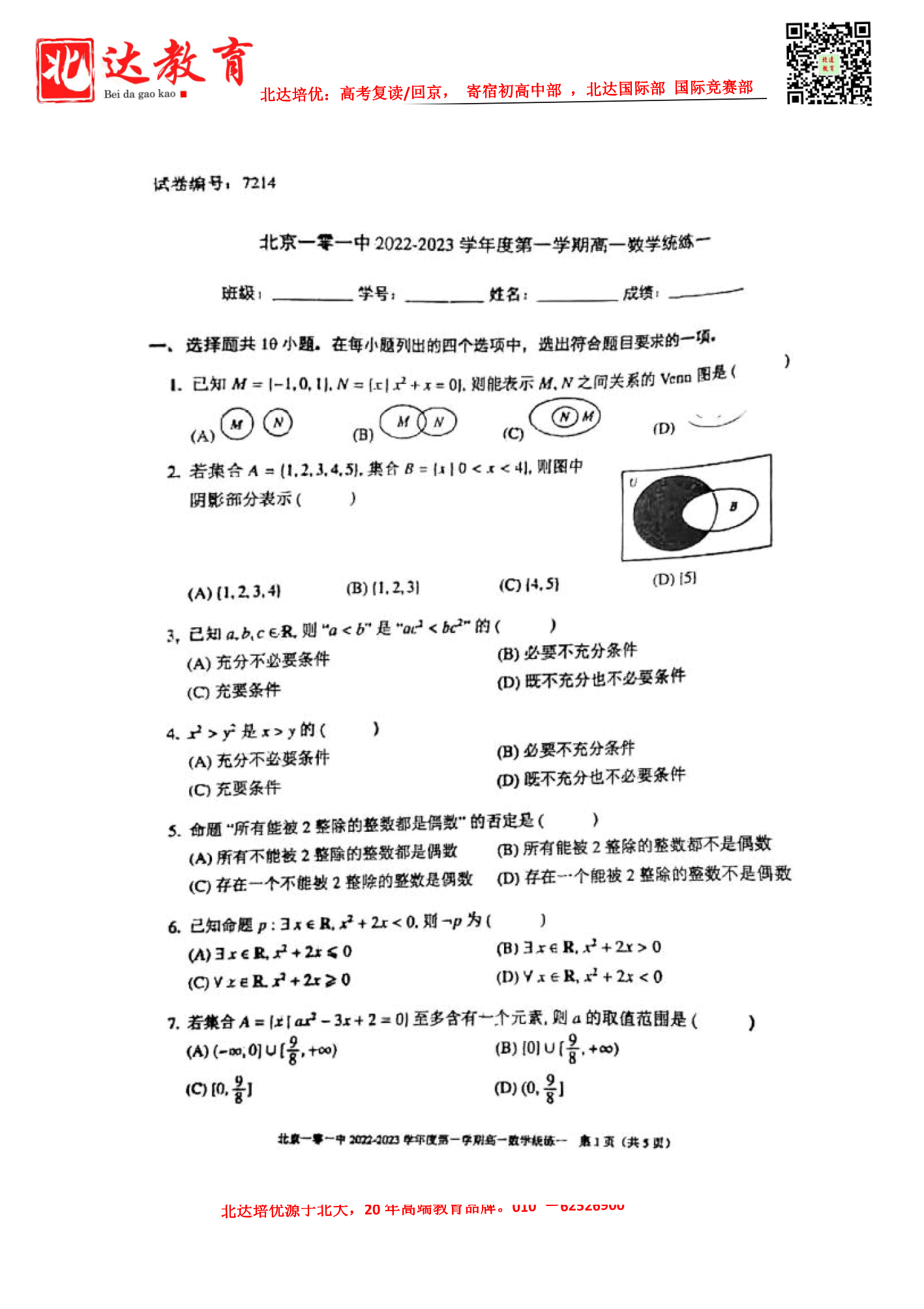 北京admw360教研组今天为大家整理的是2022-2023学年北京101中第一学期高一数学统练一,分享给大家。