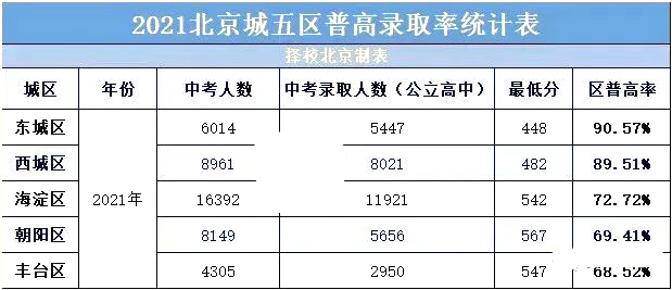 现在网上流传着各区普高率的计算以本区最后一名民办高中录取率为基准是不正确的,因为民办校是全市招生非本区独有,还有就是北京很大一部分民办高中校普高录取分极低极低,就高考而言没有参考价值,既然要统计各区普高率就要统一数据口径,要不然将导致南辕北辙,会误导家长。所以择哥用的方法是用本区最后一名普通高中校的录取分数,通过北京考试院公开的数据查找出当年各区实考考生达到这个分数的人数,然后用这个人数除以各区实考考生人数,就是该区的普高率,这样歧义最小。