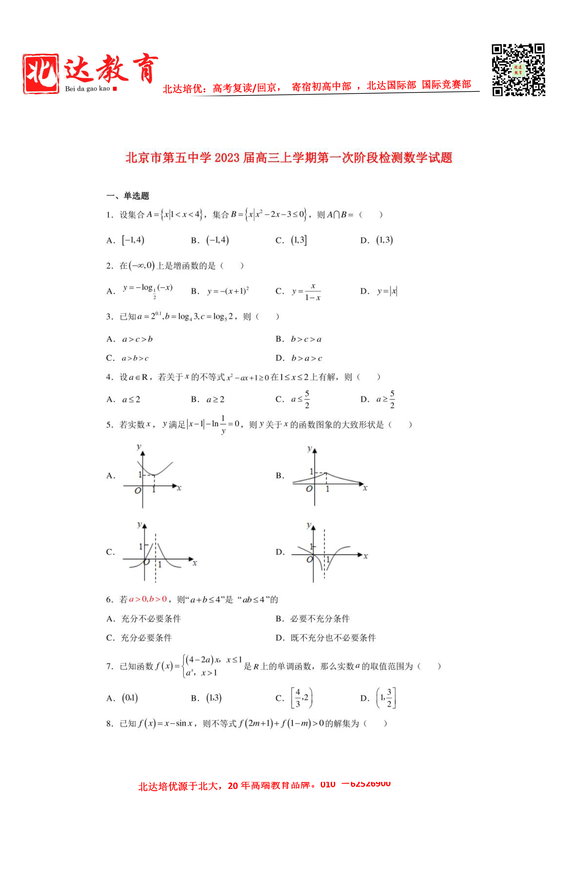 今天,北京admw360教研组为大家整理了北京市第五中学2023届高三上学期第一次阶段检测数学试卷及答案,一起来看。