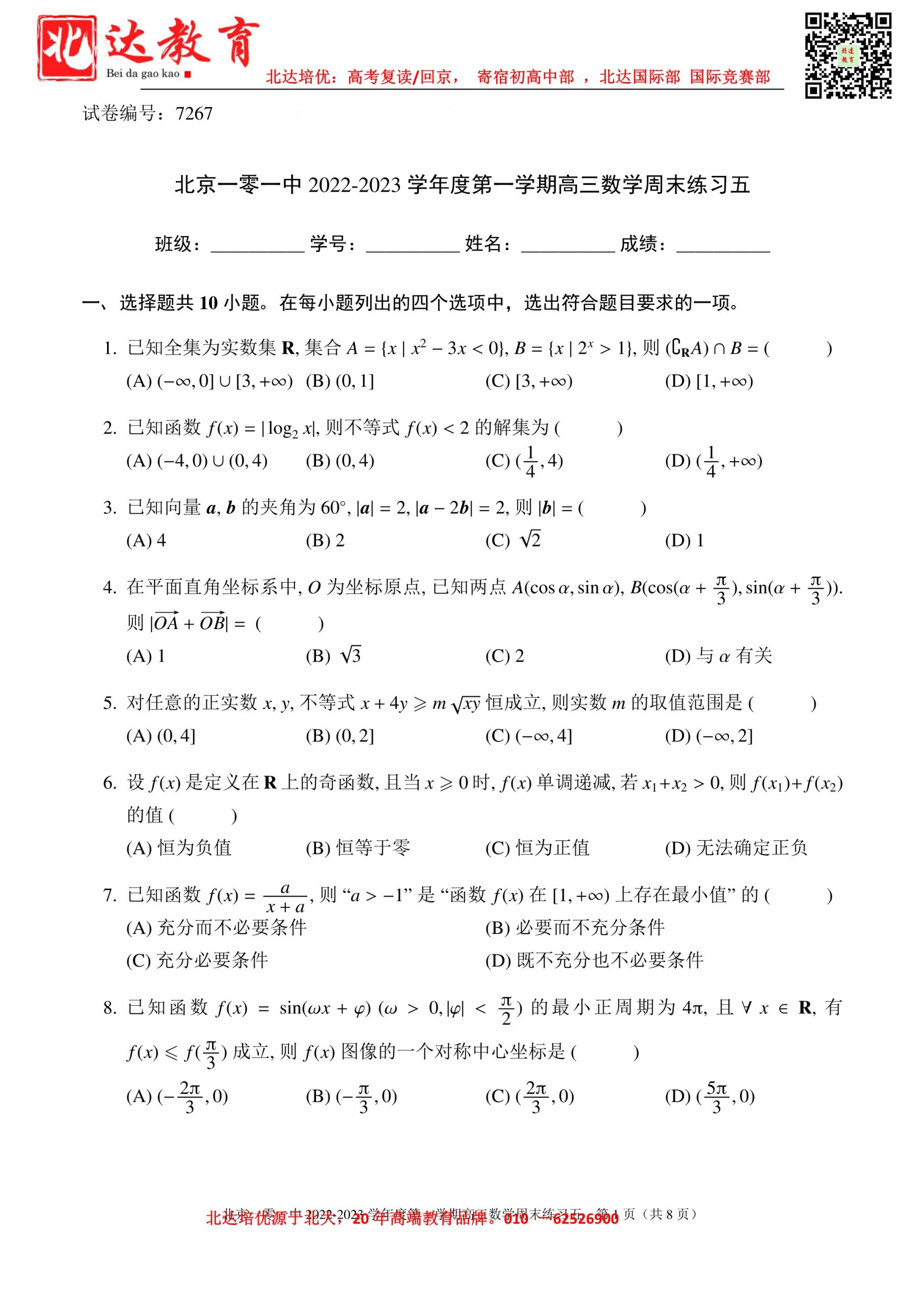 下载地址:2022年北京一零一中高三数学(周末练习五)10月试题
