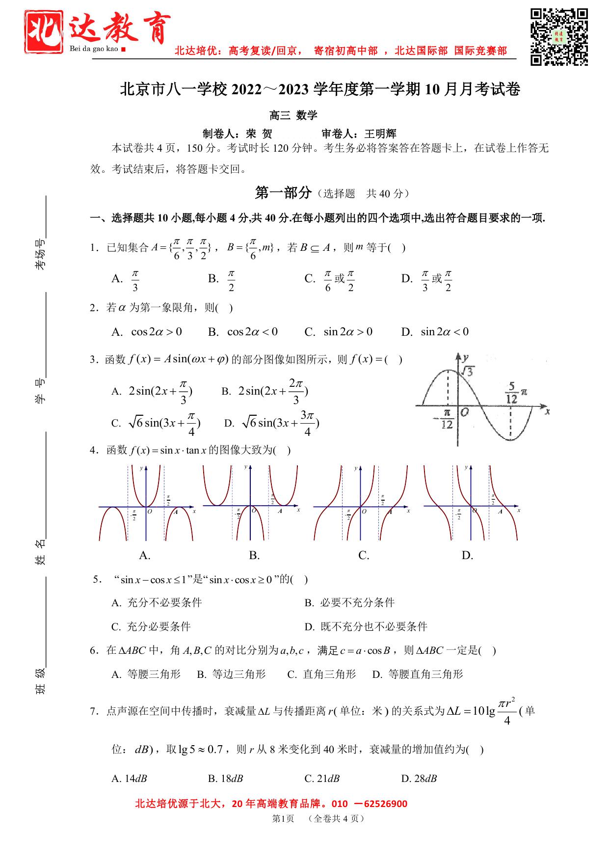 今天,北京admw360教研组为大家整理了2022北京八一学校高三10月月考数学试题及答案,一起来看。