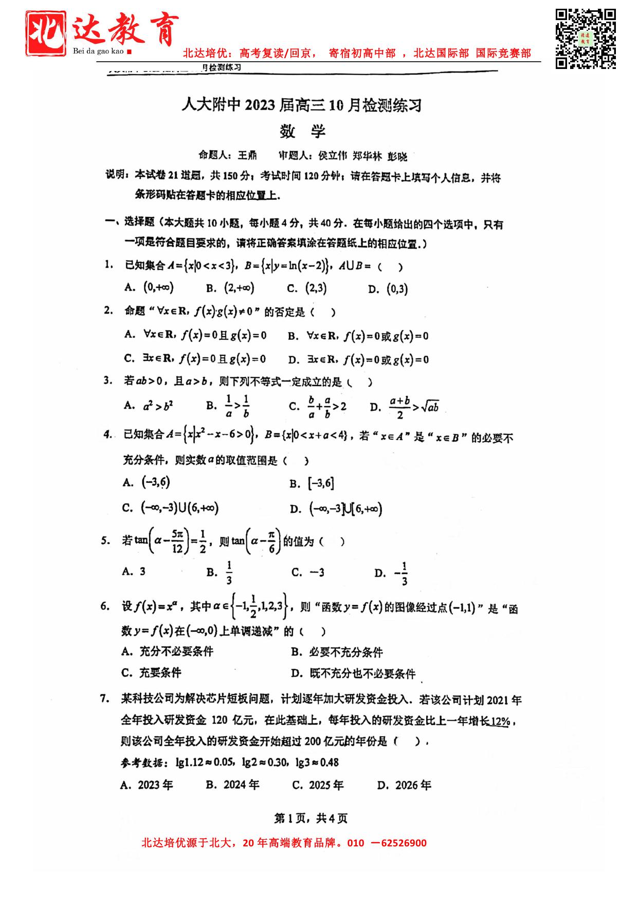 北京admw360教研组为大家整理了2022北京人大附中高三10月月考数学试题,分享给大家。