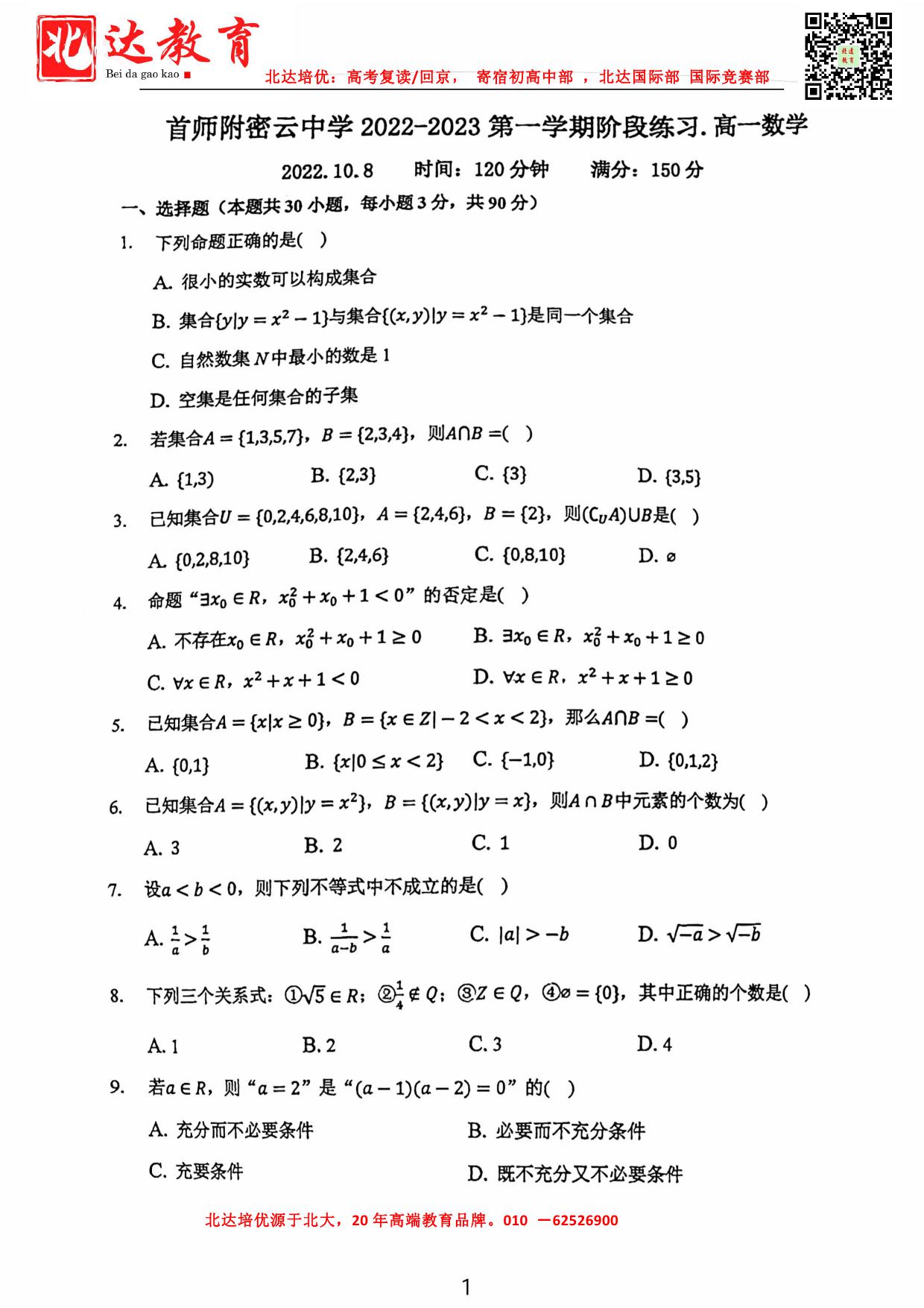 北京admw360教研组为大家整理了2022北京首师大密云中学高一10月月考数学试题,分享给大家。