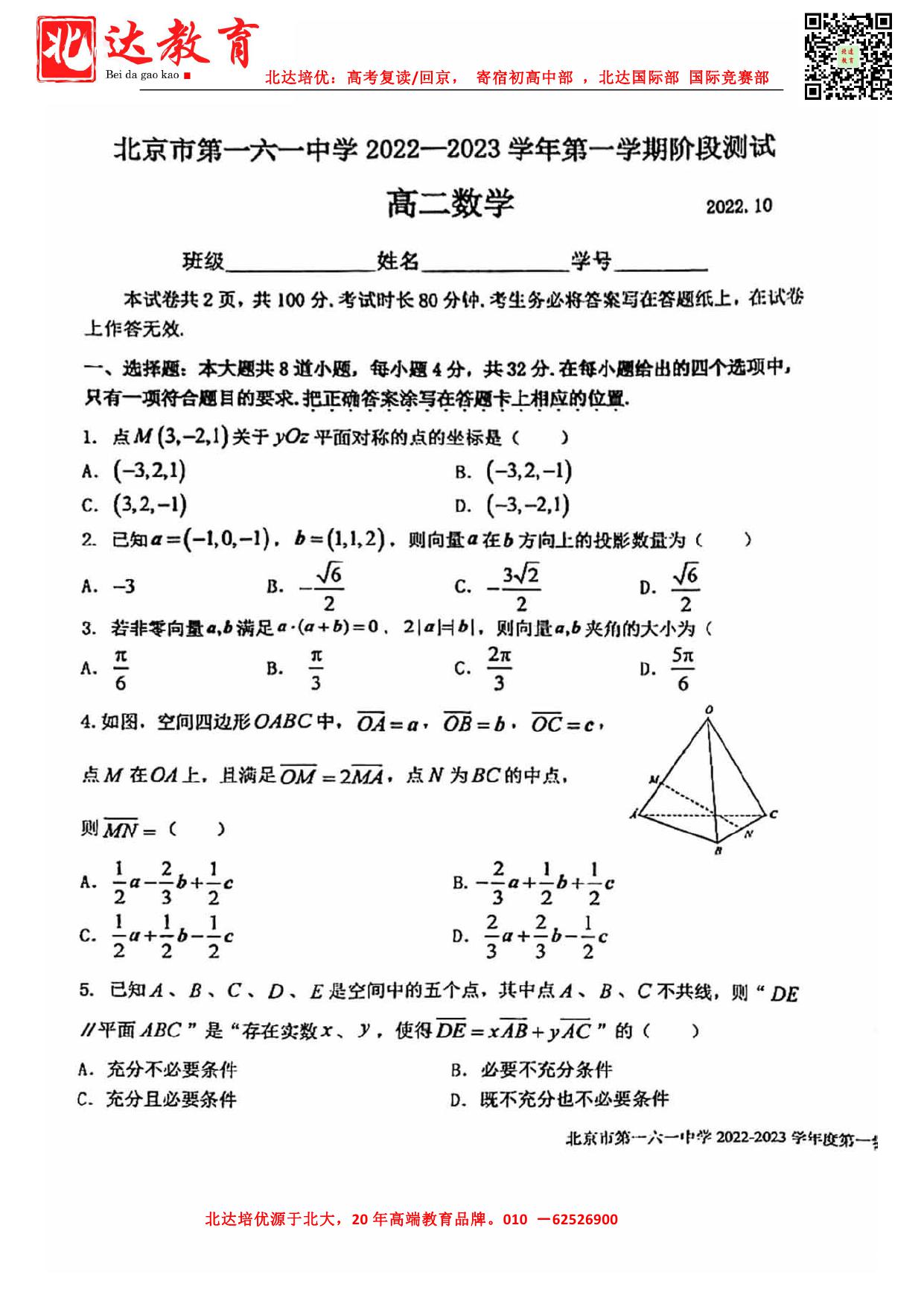 下载地址:2022北京一六一高二10月月考数学试题