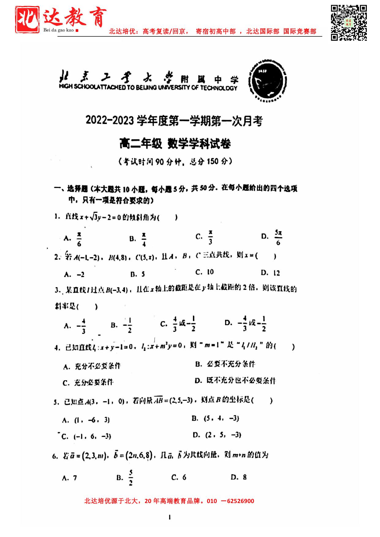 今天,北京admw360教研组为大家整理了2022北京工大附高二10月月考数学试题,一起来看。