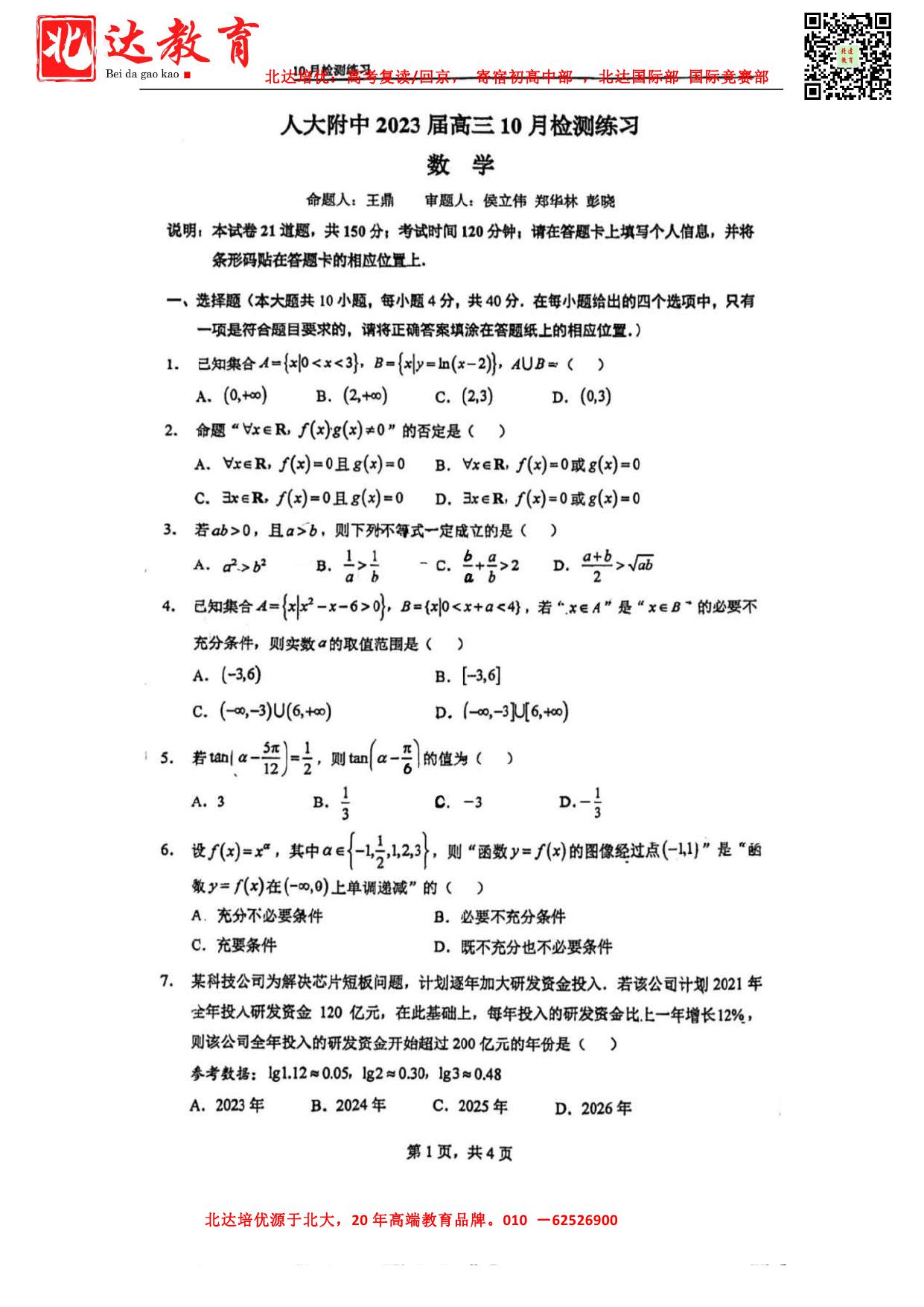 今天,北京admw360教研组为大家整理了2022北京人大附中高三10月月考数学试题及答案,一起来看。