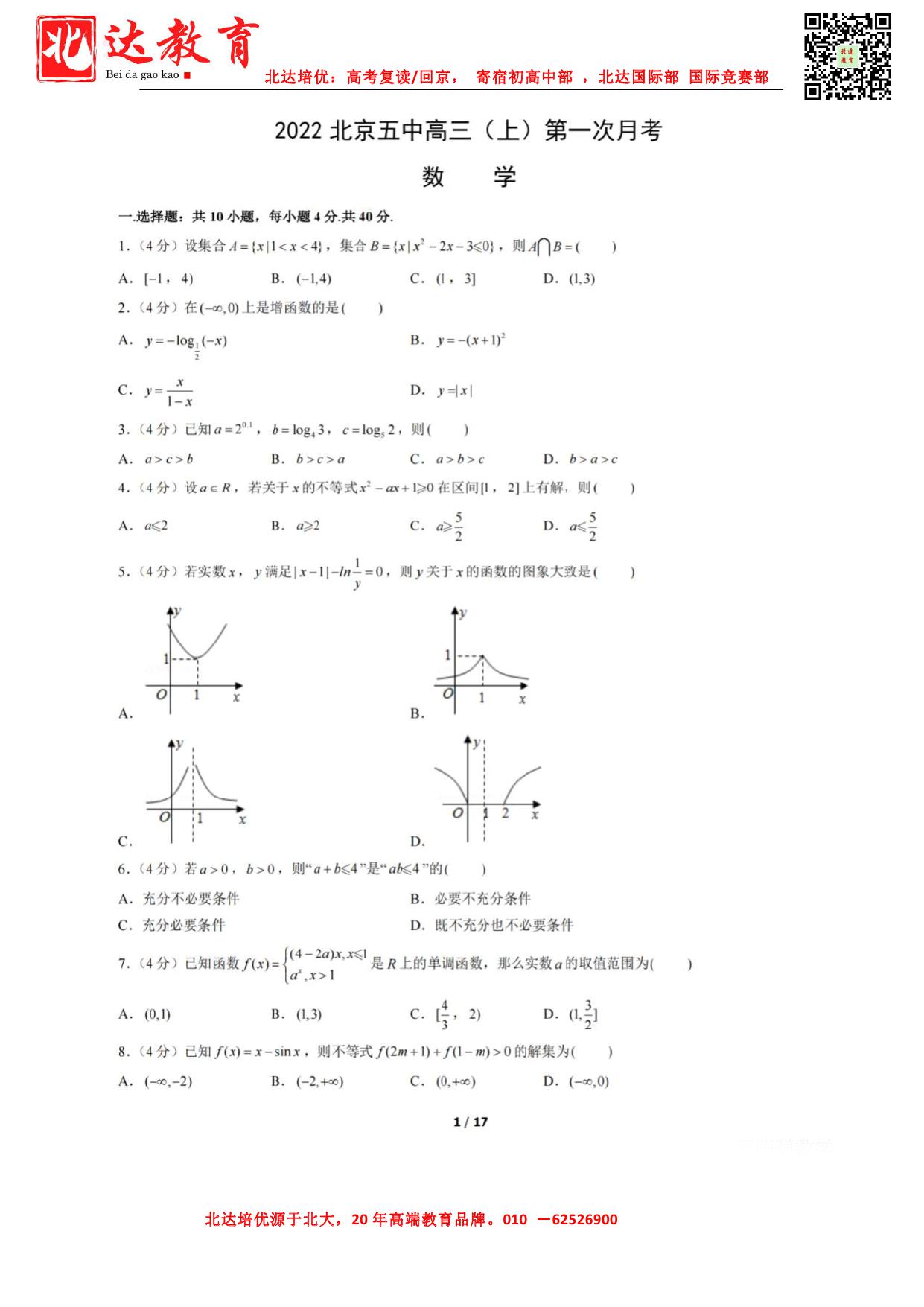 下载地址:2022北京五中高三(上)第一次月考数学试题及答案