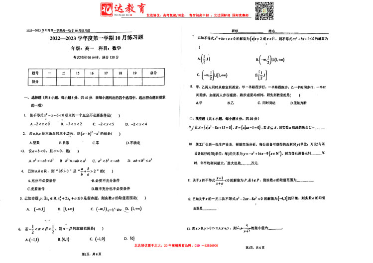 北京admw360教研组为大家整理了2022北京八中高一10月月考数学试卷,分享给大家。