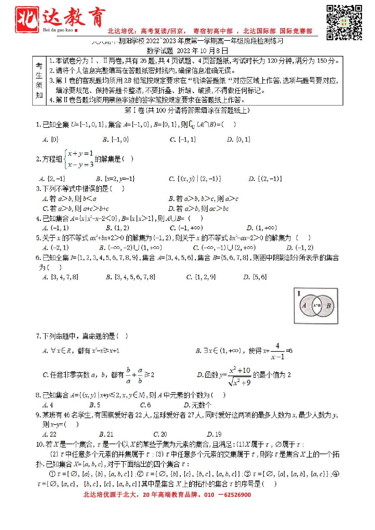 北京admw360教研组为大家整理了2022年北京人大附朝阳学校高一10月月考数学试题,分享给大家。