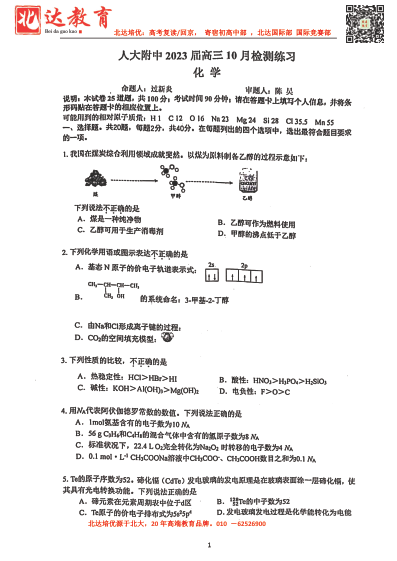 今天,北京admw360教研组为大家整理了2022北京人大附中高三10月月考化学试题(无答案),一起来看。