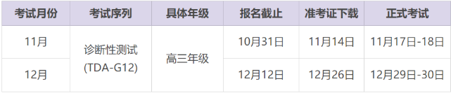 - 2022年12月诊断性测试(TDA)的考试时间现已确定,于12月29日-30日举行,报名截止时间为12月12日(24:00)。