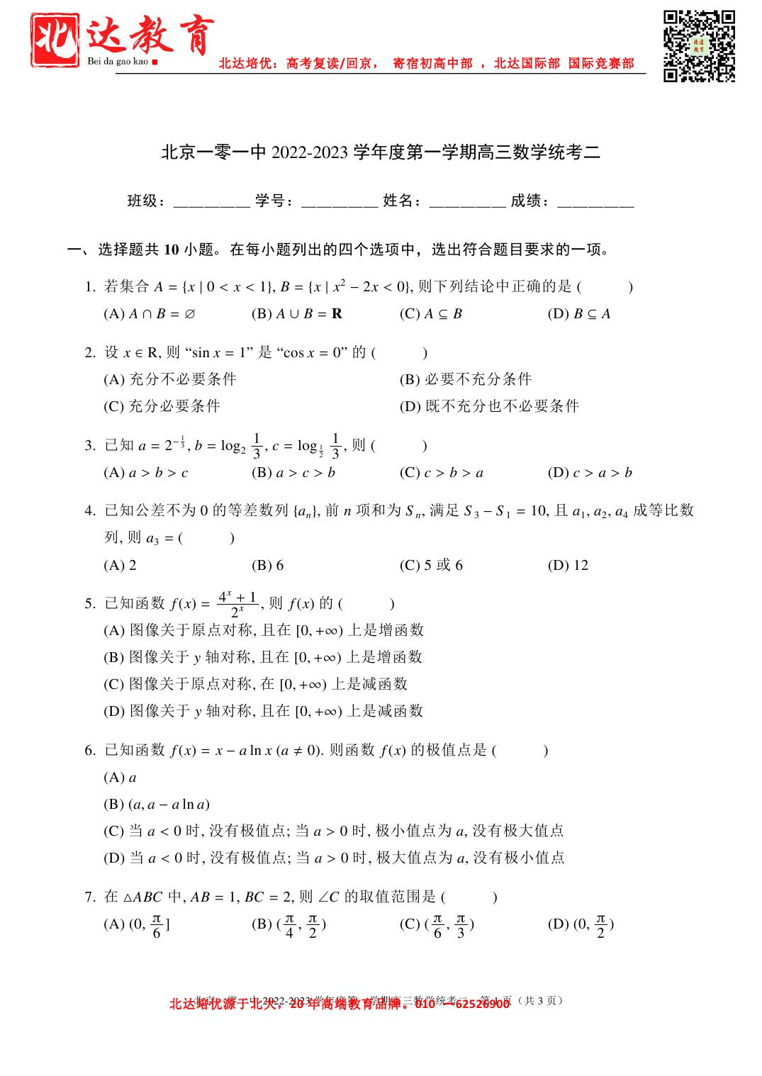 下载地址:北京一零一中2022-2023学年度第一学期高三数学统考二试题