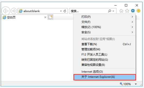 1.打开IE浏览器,点击“设置”-“关于Internet Explorer(A)”按钮,如下图: