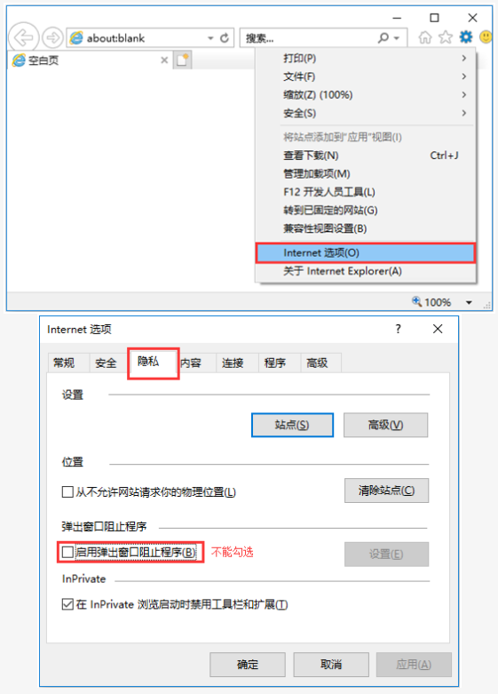 方法二:打开IE浏览器,点击“设置”-“Internet(选项)”-“隐私”,如下图: