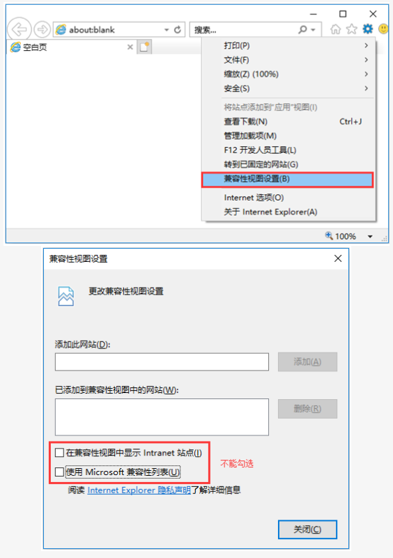 打开IE浏览器,点击“设置”-“兼容性视图设置”,如下图: