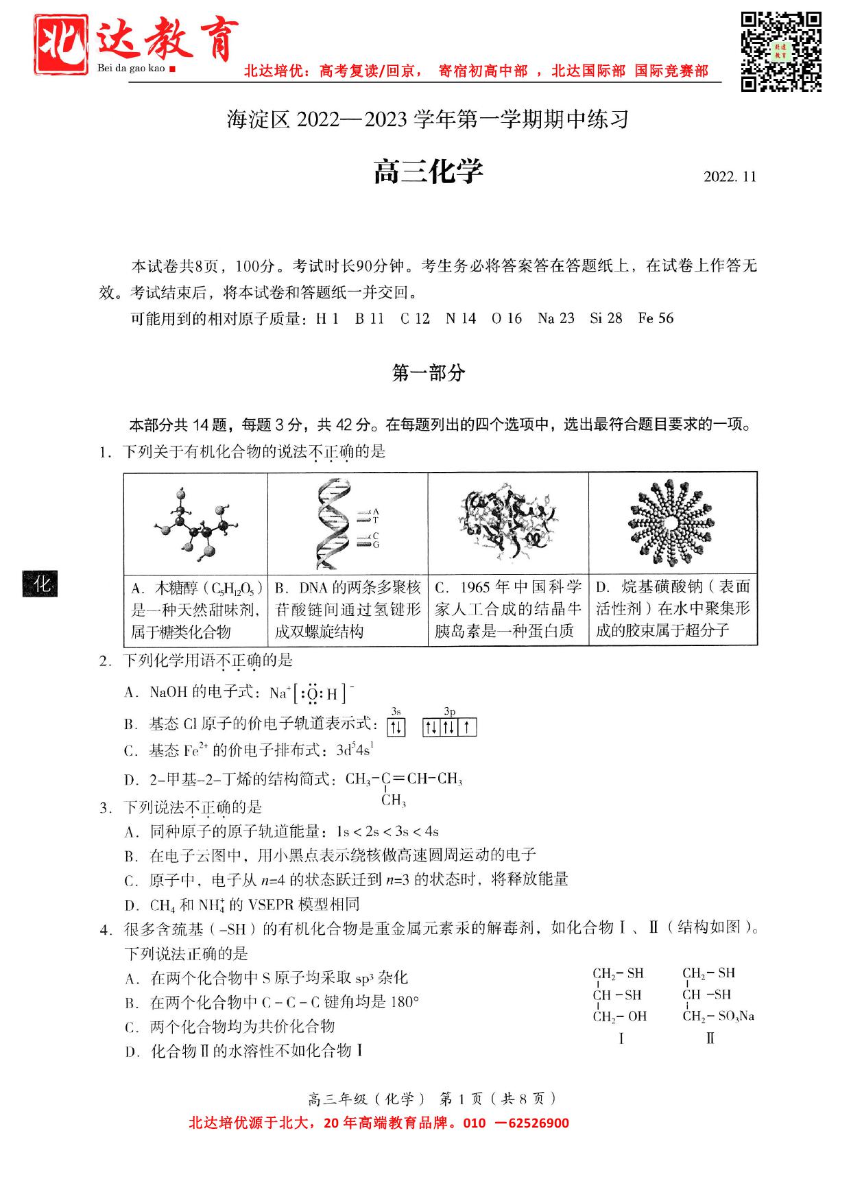 下载链接:2022-2023学年北京海淀区高三第一学期期中化学试题
