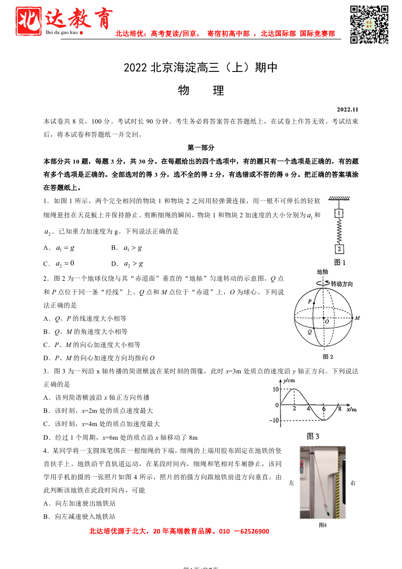 2022-2023学年北京海淀区高三期中考试与11月1日开考,北京admw360教研组收集整理了2022-2023学年北京海淀区高三第一学期期中物理试题及答案,一起来看看。