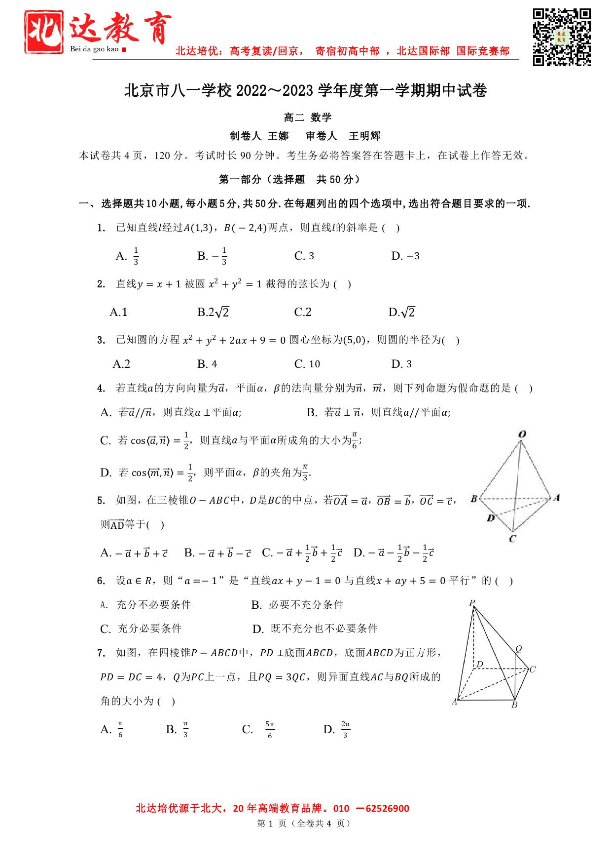 北京admw360教研组收集整理了2022-2023学年北京八一学校高二第一学期期中数学试题及答案,一起来看看。